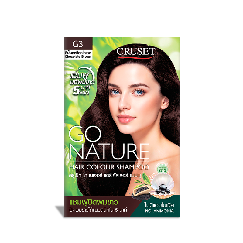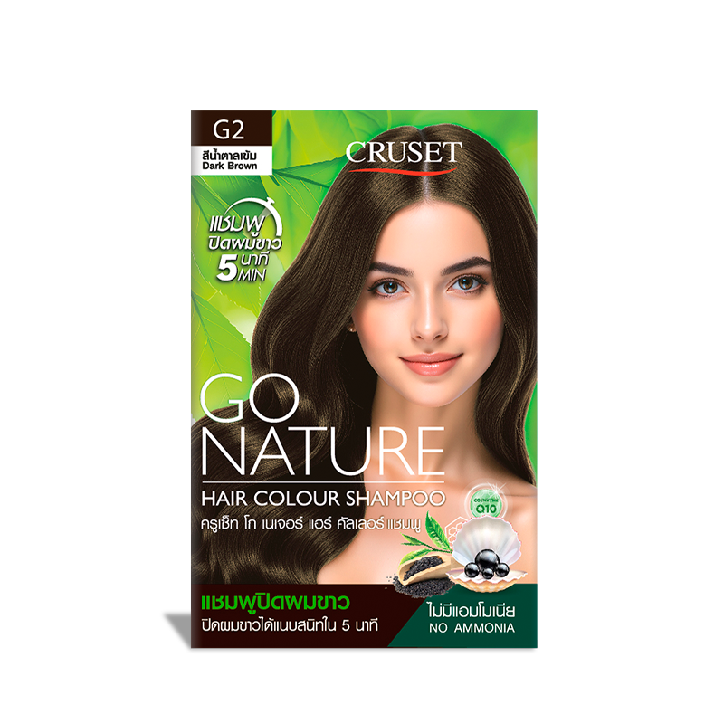 แชมพูปิดผมขาวแนบสนิท สะดวก รวดเร็ว ใน 5 นาที รังสรรค์สีผมเข้ม เด่นชัด ติดทนนาน ไม่มีแอมโมเนีย กลิ่นหอม พร้อมการบำรุงในขั้นตอนเดียว ด้วยคุณค่าจาก ไข่มุกสีดำ, งาดำ, ชาขาว, เซราไมด์-3 และโคเอนไซม์ คิวเท็น สารสกัดทรงคุณค่าที่อุดมด้วยอาหารผมชั้นเลิศ ช่วยฟื้นบำรุงเส้นผม มอบสีผมสดใสเปล่งประกาย เงางามอย่างเป็นธรรมชาติ Cruset Go Nature Hair Colour Shampoo G1 Natural Black perfectly covers grey hair in 5 minutes, experience results of intense and lasting color with refreshing scent in special formula No Ammonia in all shades. Our unique formulation enriched with valuable extracts; Black Pearl, Black Sesame, White Tea, Ceramide-3 and Coenzyme Q10 are superfoods for hair that help create bright and radiant hair color naturally.